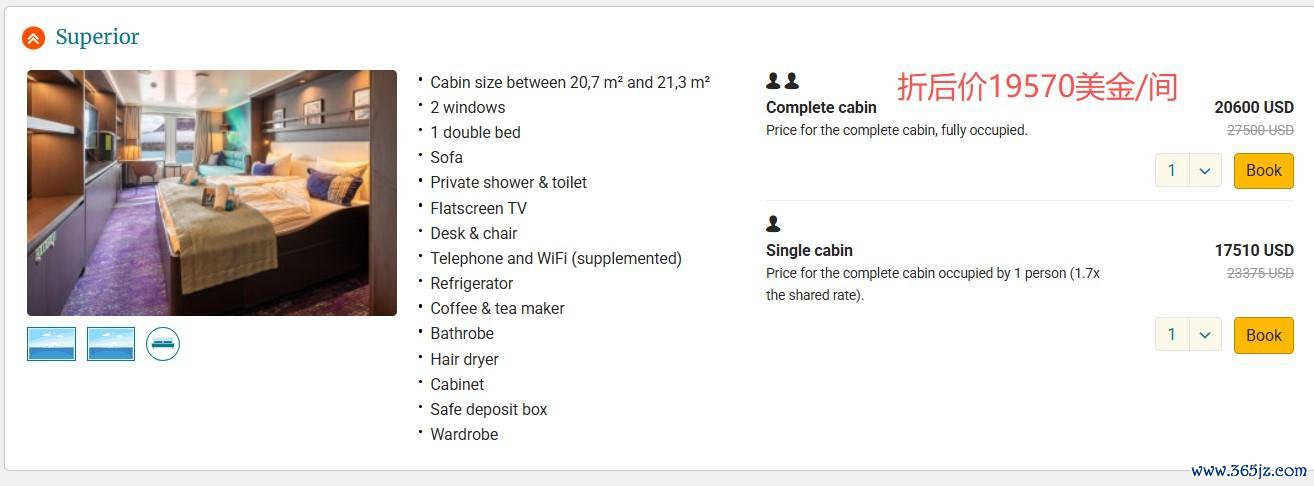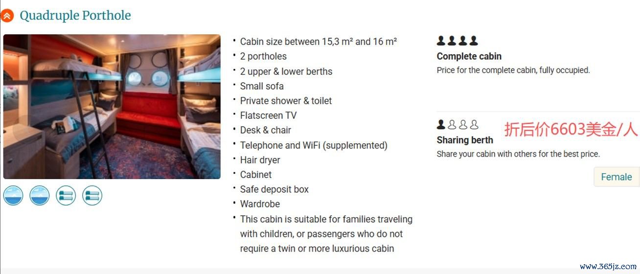 蓝鲸记者从旅行社获悉,在售卖的5万元南极游居品仅为船票,旅行社提供的邮轮价钱显现,四东说念主舷窗房折后价钱在6603好意思金/东说念主(约合东说念主民币4.67万元/东说念主),舱房面积在15.3-16平素米,舱房为4东说念主间,分为两个高下铺。