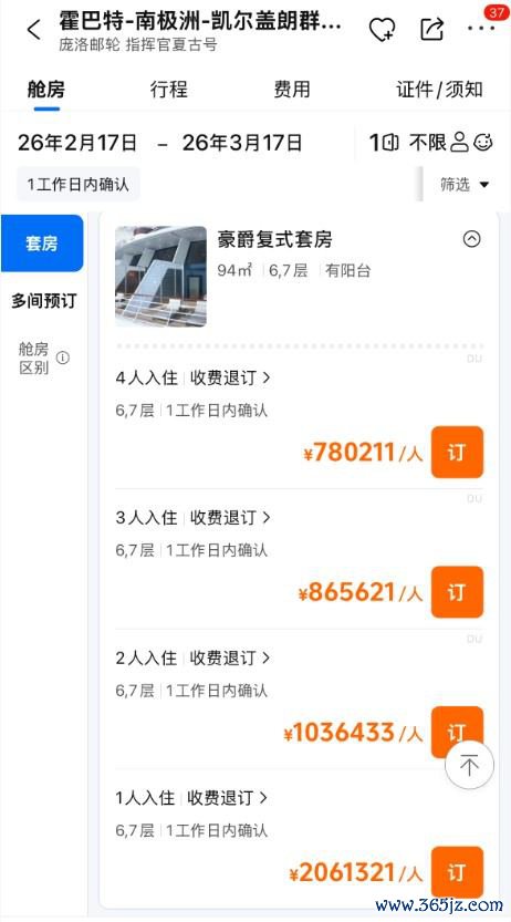 而被俞敏洪带火的“指点官夏古号”,是庞洛邮轮旗下,巨匠第一艘PC2破冰级邮轮,俞敏洪在微博中透露,夏古号12天价钱在20万-25万之间。蓝鲸记者在OTA平台检索发现,指点官夏古号面前在售卖的2026年2月17日登船的29天28晚的邮轮居品,航路为“霍巴特-南极洲-凯尔盖朗群岛-开普敦”,其中,邮轮6-7层的豪爵复式套房双东说念主入住价钱为103.64万元/东说念主、单东说念主入住价钱超200万元。